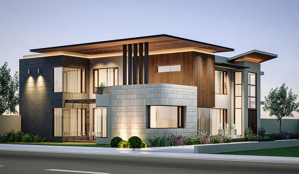 Mẫu thiết kế mặt tiền biệt thự hiện đại mặt tiền sử dụng chất liệu giả gỗ